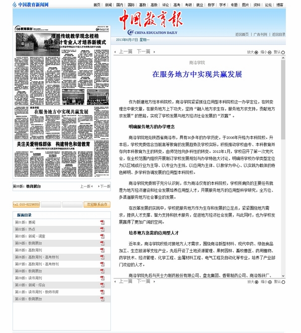 近年來(lái),在全校師生員工的共同努力下,我校教學(xué)科研工作取得了長(zhǎng)足的發(fā)展,教育教學(xué)成果豐碩、成就顯著,引起了社會(huì)各界的高度關(guān)注。6月17日,《中國(guó)教育報(bào)》刊登院長(zhǎng)張景書署名文章《商洛學(xué)院:在服務(wù)地方中實(shí)現(xiàn)共贏發(fā)展》,全面介紹了我校立足地方、服務(wù)地方,在建設(shè)特色鮮明、多學(xué)科協(xié)調(diào)發(fā)展的應(yīng)用型普通本科院校歷程中所做的工作和取得的成績(jī)。