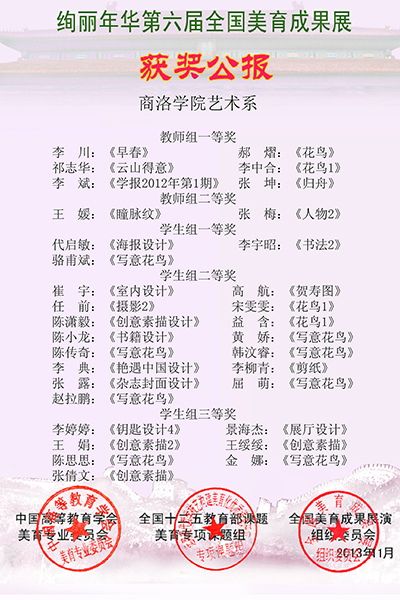 其中,藝術(shù)系被評為“全國藝術(shù)美育先進(jìn)單位”、“藝術(shù)美育教學(xué)成果二等獎(jiǎng)”、“藝術(shù)美育教學(xué)模范系”。藝術(shù)系3名教師獲得藝術(shù)美育個(gè)人教學(xué)成果一等獎(jiǎng)。藝術(shù)系李中合教授等的作品獲得特等獎(jiǎng)2項(xiàng)、一等獎(jiǎng)9項(xiàng)、二等獎(jiǎng)2項(xiàng);學(xué)生代啟敏等的作品獲得一等獎(jiǎng)3項(xiàng)、二等獎(jiǎng)15項(xiàng)、三等獎(jiǎng)7項(xiàng)。同時(shí),12名師生的作品入選2014故宮太廟全國高校教師(大學(xué)生)優(yōu)秀藝術(shù)作品展。