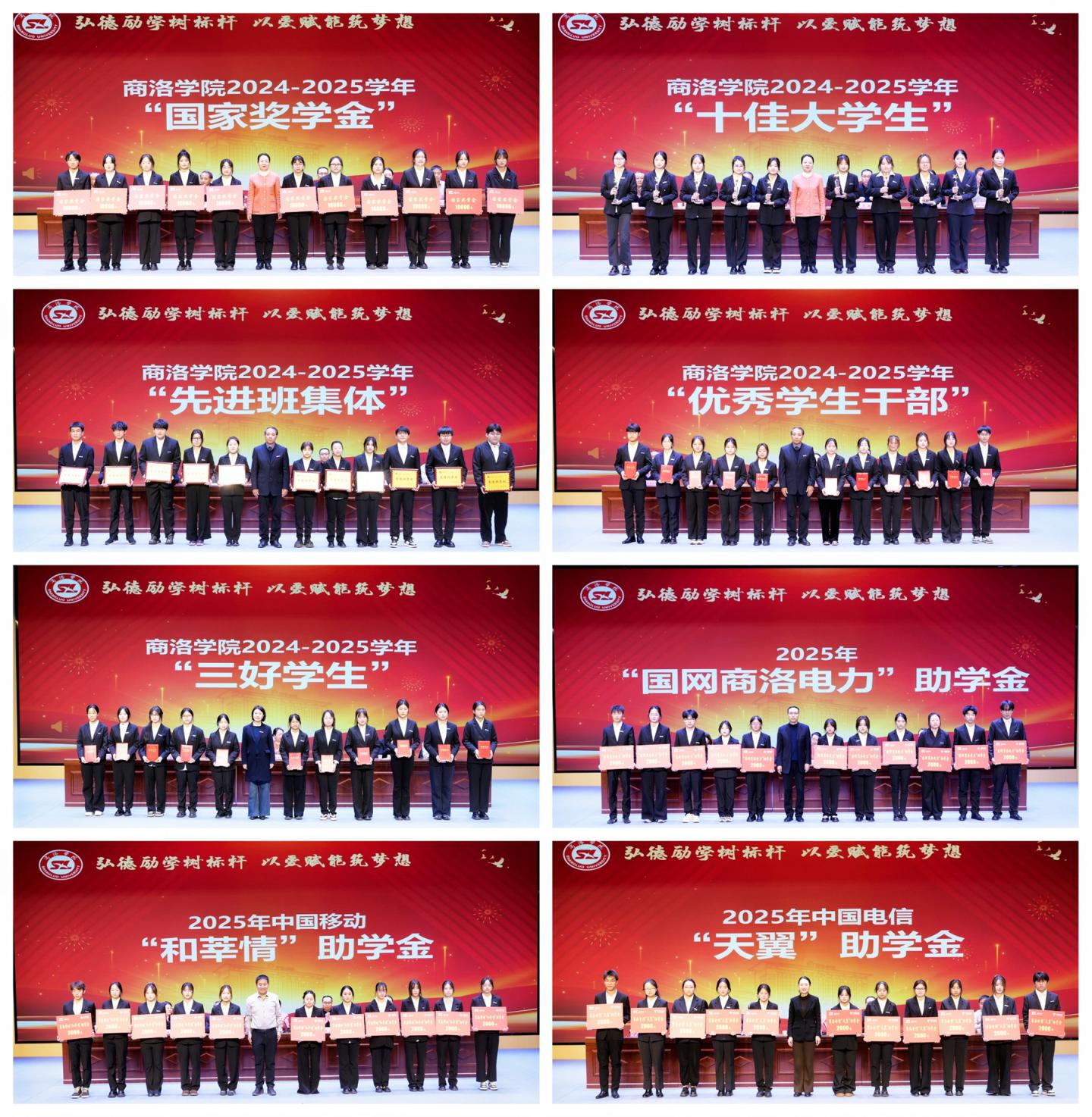 大會對榮獲國家獎學金及2024-2025學年“先進班集體”“十佳大學生”“三好學生”“優(yōu)秀學生干部”等榮譽稱號的集體與個人進行了表彰。國網(wǎng)商洛供電公司、商洛電信、商洛移動等企業(yè)代表分別向“國網(wǎng)商洛電力助學金”“天翼助學金”“和莘情助學金”受助學生發(fā)放了資助款。