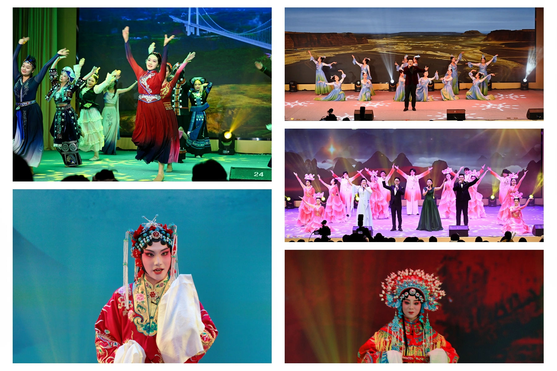 第三篇章“逐光而上·赴新程”激昂奏響奮進(jìn)號(hào)角。歌伴舞《雪白的鴿子》寄托美好期盼;特邀專業(yè)演員與藝術(shù)學(xué)院合作的戲曲《盛世霓裳》華美亮相,國(guó)粹生香;大型民族舞蹈《民族歡歌》場(chǎng)面恢弘,舞出了團(tuán)結(jié)奮進(jìn)的磅礴氣勢(shì);藝術(shù)學(xué)院傾力打造的歌伴舞《春風(fēng)十萬(wàn)里》,以壯麗的畫(huà)面與恢弘的歌聲,描繪出國(guó)家昌盛、萬(wàn)象更新的動(dòng)人畫(huà)卷。