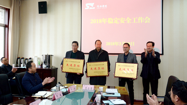 黨委書(shū)記龍治剛傳達(dá)了全省高校穩(wěn)定安全工作會(huì)議精神,與職能部門(mén)及院部負(fù)責(zé)人代表簽訂了2018年穩(wěn)定安全工作責(zé)任書(shū)。紀(jì)委書(shū)記王思懷傳達(dá)了全省高校全面從嚴(yán)治黨工作會(huì)議精神。副校長(zhǎng)魏書(shū)堂為先進(jìn)集體及個(gè)人代表頒獎(jiǎng)。