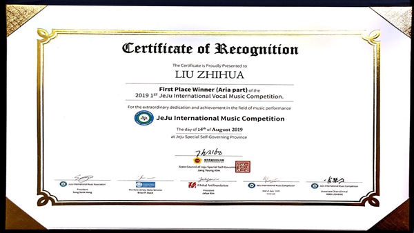 本次大賽由韓國(guó)濟(jì)州特別自治省政府主辦,全球藝術(shù)院、韓國(guó)文化藝術(shù)家協(xié)會(huì)及韓國(guó)漢拿大學(xué)協(xié)辦。來(lái)自中國(guó)、美國(guó)、俄羅斯、韓國(guó)、加拿大、土耳其等國(guó)家的300余名選手參加了比賽。比賽分聲樂(lè)、鋼琴、器樂(lè)三個(gè)類(lèi)別。劉志華參加了聲樂(lè)類(lèi)比賽,演唱了《偷灑一滴淚》、《星光燦爛》兩首歌劇詠嘆調(diào),經(jīng)兩輪激烈角逐,最終獲獎(jiǎng)。