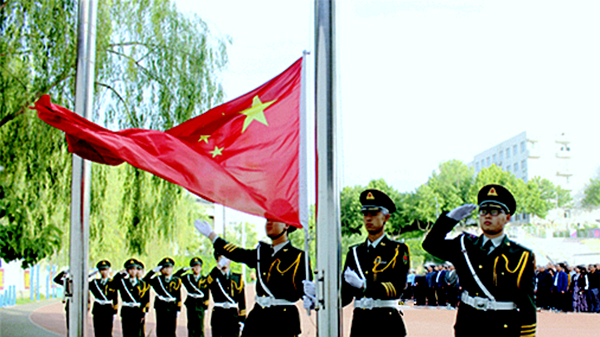 7點20分,在全體師生的注目下,國旗護衛(wèi)隊護送鮮艷的五星紅旗進場,伴隨著雄壯的國歌,五星紅旗冉冉升起,全體師生神情肅穆,向莊嚴的國旗表達著最崇高的敬意。