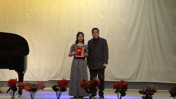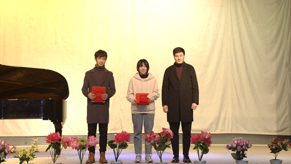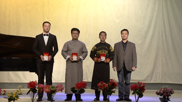 本次藝術(shù)活動(dòng)旨在深入貫徹全國(guó)教育大會(huì)精神,用多彩的藝術(shù)形式引導(dǎo)大學(xué)生堅(jiān)定理想信念,營(yíng)造良好校園文化氛圍?;顒?dòng)包括好聲音、書(shū)畫(huà)、誦讀三個(gè)比賽環(huán)節(jié),其中好聲音、書(shū)畫(huà)比賽分為專(zhuān)業(yè)組和非專(zhuān)業(yè)組兩個(gè)比賽組別,經(jīng)過(guò)激烈角逐、現(xiàn)場(chǎng)打分和綜合評(píng)比,最終好聲音比賽《望月》作品獲得專(zhuān)業(yè)組一等獎(jiǎng)、《出現(xiàn)又離開(kāi)》作品獲得非專(zhuān)業(yè)組一等獎(jiǎng);書(shū)畫(huà)比賽《自畫(huà)像》作品獲得專(zhuān)業(yè)組一等獎(jiǎng)、《錦上添花》作品獲得非專(zhuān)業(yè)組一等獎(jiǎng);誦讀比賽《祖國(guó)頌》作品獲得一等獎(jiǎng),另有10個(gè)參賽作品獲得二等獎(jiǎng),15個(gè)參賽作品獲得三等獎(jiǎng)。參加晚會(huì)的相關(guān)單位負(fù)責(zé)人現(xiàn)場(chǎng)分別為獲獎(jiǎng)作品頒發(fā)了榮譽(yù)證書(shū)并合影留念。