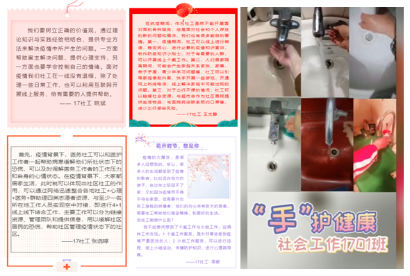 超人也會有鎧甲,防范意識不掉下。從“防護知識合集”到“宅家防護攻略”,從“疫情思考”再到“社工學子版洗手舞”,這其中囊括著社工學子的“助人自助”和社會工作專業(yè)的“用生命影響生命”。