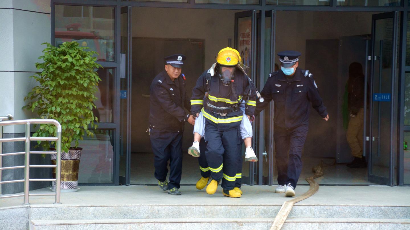 本次演練以16B男生公寓樓起火為假設情景,共有火災逃生、火場救援、滅火演示三個環(huán)節(jié)。隨著火災疏散警報聲響起,火災逃生演練拉開了序幕,全體學生按照設定的疏散路線,在輔導員、公寓管理員及校警的帶領下,采取掩口鼻、彎腰姿勢從宿舍快速有序地撤離到安全區(qū)域;醫(yī)護人員立即對“受傷學生”進行模擬救治;消防救援隊到達現(xiàn)場后迅速將火情撲滅。整個演練過程逼真、井然有序,使師生們直觀地學習到了火災處理正確方法,加深了師生對消防安全知識的理解及消防器材的正確使用方法,為筑牢學校安全“防火墻”奠定了堅實的基礎。