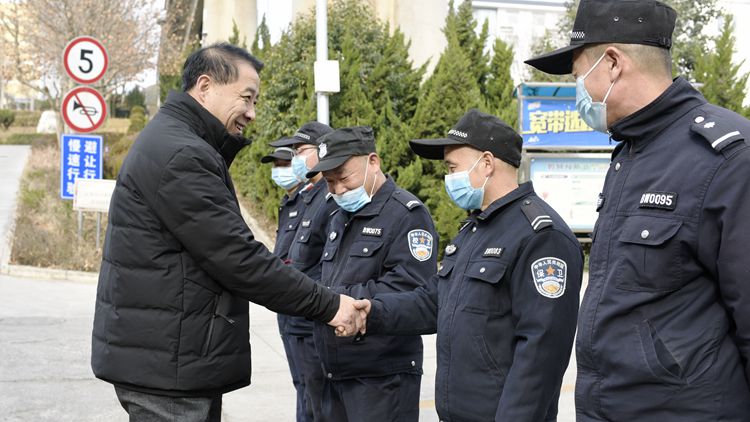 在黨委辦公室·院長辦公室、保衛(wèi)處、后勤保障處和丹江校區(qū)管理處負(fù)責(zé)人的陪同下,彭虎軍一行先后前往北新街校區(qū)和丹江校區(qū)各處門衛(wèi)、教學(xué)樓、圖書館、公寓管理中心、動(dòng)力中心、體育場(chǎng)值班室和保衛(wèi)處監(jiān)控室等一線崗位,看望慰問正在辛勤工作的值班人員。每到一處,彭虎軍、王新軍都與值班人員親切握手,代表學(xué)校黨政對(duì)春節(jié)期間依然奉獻(xiàn)在一線的工作人員表示衷心感謝,并親手送上節(jié)日慰問品。彭虎軍要求全體值班人員一定要把疫情防控和安全穩(wěn)定放在首位,確保在校師生度過一個(gè)安全愉快的春節(jié)。