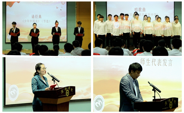 在“誦經(jīng)典”環(huán)節(jié)中,馬怡聰、王雯靜、程鑫瑞、張鴻超四位同學(xué)激情誦讀了《少年中國(guó)說(shuō)》,在鏗鏘有力的誦讀中,同學(xué)們感悟到了梁?jiǎn)⒊壬鷮?duì)中華少年的殷切期盼,激發(fā)了同學(xué)們努力拼搏、建功立業(yè)新時(shí)代的豪情壯志。一曲經(jīng)典紅歌《沒(méi)有共產(chǎn)黨就沒(méi)有新中國(guó)》,為同學(xué)們展現(xiàn)了中國(guó)共產(chǎn)黨激蕩百年的歷史畫卷。