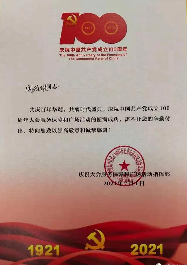 今年3月份,周雅琳上報(bào)了個(gè)人演奏視頻,通過(guò)了上級(jí)預(yù)選,4月下旬來(lái)到北京參加集訓(xùn)。訓(xùn)練期間,她始終以最高標(biāo)準(zhǔn)來(lái)嚴(yán)格要求自己,每天早起練基本功,吹長(zhǎng)音,晚上加班加點(diǎn)唱譜。經(jīng)過(guò)她的不懈努力與刻苦訓(xùn)練,終于,在7月1日當(dāng)天,她與聯(lián)合軍樂(lè)團(tuán)的戰(zhàn)友們一起,站在祖國(guó)的心臟---天安門(mén)廣場(chǎng),奏響激情澎湃的樂(lè)章,為大會(huì)增添動(dòng)人的華彩,也為商洛和學(xué)校爭(zhēng)得了榮譽(yù),充分展示了我校學(xué)子昂揚(yáng)向上的精神風(fēng)貌。