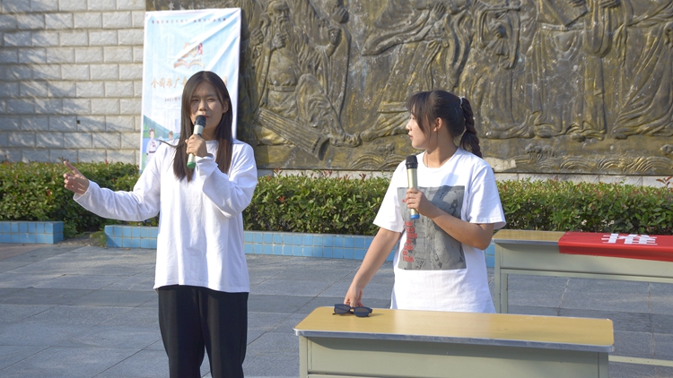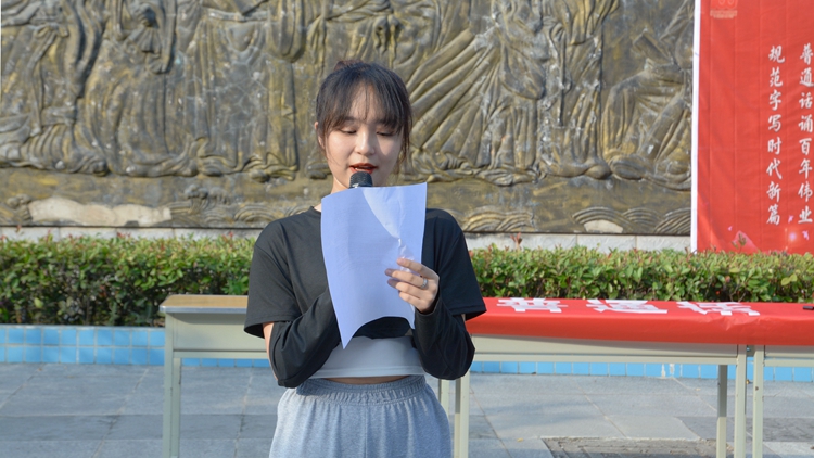 人文學(xué)院學(xué)生代表王瀅在表態(tài)發(fā)言中呼吁全體學(xué)生要規(guī)范使用普通話,讓規(guī)范語(yǔ)言之花開(kāi)遍美麗的校園。學(xué)生朱怡寧、丁欣玉為大家表演了相聲《普通話》,通過(guò)生動(dòng)有趣的表演向展示了不良語(yǔ)言習(xí)慣及普通話的別樣韻味,切實(shí)增強(qiáng)了大家的語(yǔ)言規(guī)范意識(shí)。王林等學(xué)生向大家朗誦了紅色詩(shī)歌《永遠(yuǎn)跟黨走》,帶領(lǐng)大家重溫了先輩們?cè)⊙獖^戰(zhàn)的革命歲月,讓大家在詩(shī)歌中感悟黨的崢嶸歲月,體會(huì)語(yǔ)言的動(dòng)人魅力。