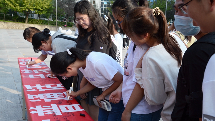 現(xiàn)場(chǎng)師生在推廣橫幅上進(jìn)行簽字,表達(dá)了學(xué)習(xí)國(guó)家通用語(yǔ)言文字的決心。