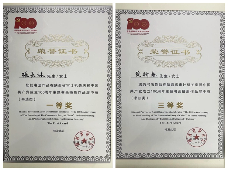 為慶祝中國(guó)共產(chǎn)黨成立100周年,陜西省審計(jì)廳舉辦了以“奮斗百年路,啟航新征程”為主題的書(shū)畫(huà)攝影展,我校參展的書(shū)畫(huà)作品在400多幅作品中喜獲佳績(jī)。其中,藝術(shù)學(xué)院張長(zhǎng)林老師的書(shū)法作品榮獲一等獎(jiǎng),黃新春書(shū)法作品榮獲三等獎(jiǎng),審計(jì)處榮獲優(yōu)秀組織獎(jiǎng)。