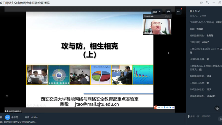 為推動第九屆網(wǎng)絡安全宣傳周活動深入開展,提升師生網(wǎng)絡安全意識和防護技能,營造網(wǎng)絡安全人人有責、網(wǎng)絡安全人人參與的濃厚氛圍,9月7日下午,我校通過線上平臺舉辦網(wǎng)絡安全知識專家報告會。大會邀請西安交通大學網(wǎng)絡空間安全學院副院長、智能網(wǎng)絡與網(wǎng)絡安全教育部重點實驗室副主任陶敬老師作了題為《攻與防,相生相克!》的專題報告。報告會由信息化建設與管理處負責人付軍昌主持,各單位網(wǎng)絡安全和信息化工作負責人、網(wǎng)絡安全和信息化專員,教師代表及2019、2020、2021級全體學生5000余人線上參加報告會。
