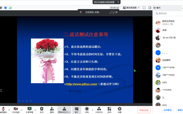 啟動(dòng)儀式上,全體參會(huì)人員共同觀看了第25屆全國推普周公益宣傳視頻,教務(wù)處副處長李會(huì)榮介紹了本屆“推普周”基本情況。國家級(jí)普通話水平測試員、人文學(xué)院余琪教授以“‘提升語言文字應(yīng)用水平,做新時(shí)代文明大學(xué)生’—普通話學(xué)習(xí)方法與測試技巧”為題作了專題培訓(xùn)報(bào)告,從普通話的概念、推廣普通話的重大意義、計(jì)算機(jī)輔助普通話測試流程、普通話測試四類題型及測評(píng)要點(diǎn)、普通話測試訓(xùn)練要領(lǐng)及注意事項(xiàng)、提升普通話水平的方法及學(xué)習(xí)途徑等方面進(jìn)行了詳細(xì)講解,與參會(huì)學(xué)生進(jìn)行了線上答疑和互動(dòng)交流。