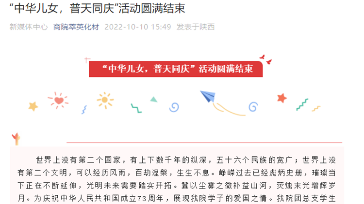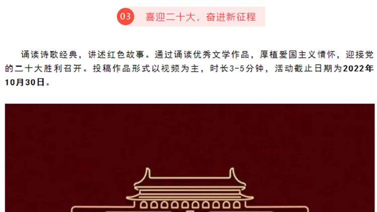 為深入開展“青春獻禮黨的二十大,強國有我新征程”主題宣傳教育活動,熱烈慶祝中華人民共和國成立73周年,引導和激勵廣大師生厚植愛國主義情懷,營造網絡文明新風,國慶節(jié)期間,我校組織開展了豐富多彩的“喜迎黨的二十大 歡度國慶節(jié)”系列主題活動。廣大師生通過各級各類網絡平臺和線上活動,用自己的方式為祖國送上美好祝福,禮贊新時代奮進征程,以良好的精神面貌和昂揚姿態(tài)喜迎黨的二十大勝利召開。