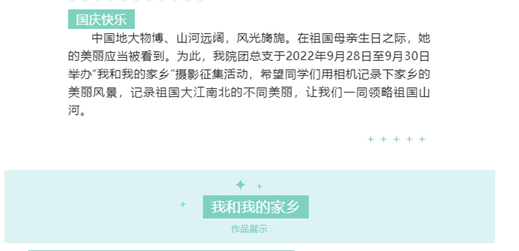 經濟管理學院舉辦了“我和我的家鄉(xiāng)”作品展,通過同學們記錄的家鄉(xiāng)美麗風景,展現(xiàn)祖國的大好河山,激發(fā)學生愛國之情和建設家鄉(xiāng)之志。
