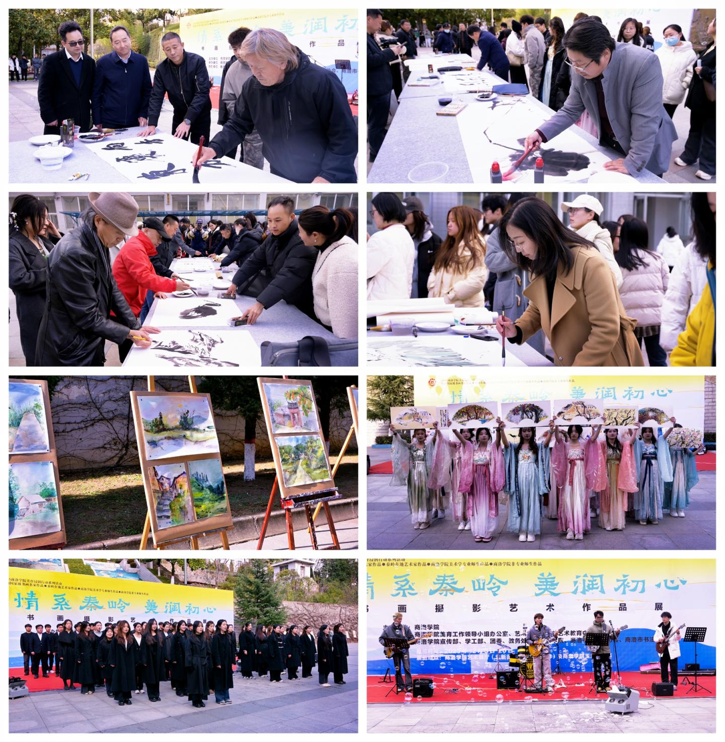本次活動通過藝術(shù)作品展覽、現(xiàn)場創(chuàng)作與文藝節(jié)目表演相結(jié)合的形式展開。在大學(xué)生美育合唱團深情演唱《南山南》和美育非遺社團表演的《書簡舞》中,整場活動正式拉開帷幕。在“情系秦嶺”書畫筆會環(huán)節(jié),校內(nèi)外書畫名家與師生代表在民樂伴奏下即興揮毫,現(xiàn)場創(chuàng)作的作品筆墨酣暢,引來陣陣贊嘆。同步進行的“秦嶺記憶”百人百米長卷共創(chuàng)活動將氣氛推向高潮,嘉賓與師生們紛紛提筆,在百米長卷上共同描繪心中的秦嶺山水、風(fēng)物人情。活動現(xiàn)場還安排了藝術(shù)家交流互動與文創(chuàng)贈品環(huán)節(jié),有效促進了藝術(shù)經(jīng)驗的分享傳承,營造了濃郁的校園文化藝術(shù)氛圍。