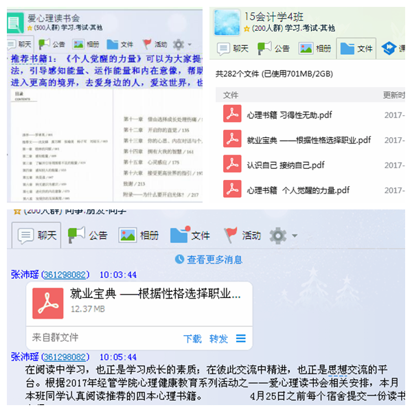 此次讀書(shū)活動(dòng)以網(wǎng)絡(luò)(QQ、微信群)為平臺(tái)組建“愛(ài)心理讀書(shū)會(huì)”,心理輔導(dǎo)員定期推薦閱讀與大學(xué)生生活密切相關(guān)的心理書(shū)籍,將PDF電子版本的《個(gè)人覺(jué)醒的力量》、《習(xí)得性無(wú)助》、《認(rèn)識(shí)自己,接納自己》和《就業(yè)寶典:根據(jù)性格選擇職業(yè)》等心理書(shū)籍傳至群共享,各班心理委員組織學(xué)生在固定時(shí)間進(jìn)行線下集體閱讀,每個(gè)周三下午與心理輔導(dǎo)員進(jìn)行線上溝通、答疑解惑,4月底各班提交讀書(shū)心得并開(kāi)展全院讀書(shū)評(píng)比活動(dòng),達(dá)到吸引讀書(shū)、方便讀書(shū)的活動(dòng)目的。