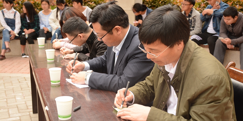 4月14日,數(shù)計(jì)學(xué)院團(tuán)總支在二號(hào)教學(xué)樓前舉辦“與書(shū)同行,墨香存華”活動(dòng)簽字儀式,2016級(jí)全體同學(xué)參加本次活動(dòng)。