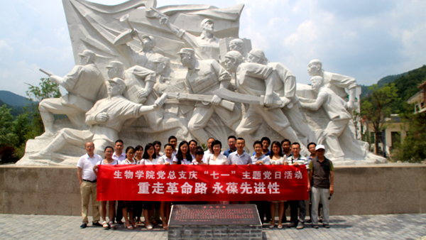 ——生物學(xué)院黨總支舉辦慶“七一”“重走革命路 永葆先進(jìn)性” 活動(dòng)。為慶祝中國共產(chǎn)黨建黨九十六周年華誕,6月29日,生物學(xué)院黨總支組織23名黨員赴商州區(qū)北寬坪鎮(zhèn)唐渠參觀商洛縣政府遺址、“中原突圍”紀(jì)念雕塑,開展“七一”主題活動(dòng),接受紅色革命再教育?;顒?dòng)期間,黨員們參觀了“中原突圍”紀(jì)念雕塑,重溫中原軍區(qū)沖破重重包圍,歷盡艱難,勝利地完成戰(zhàn)略轉(zhuǎn)移任務(wù)的革命事跡;隨后,參觀了商洛縣政府遺址,并舉行重溫入黨誓詞、合唱《沒有共產(chǎn)黨就沒有新中國》和黨的知識(shí)競答等活動(dòng)。