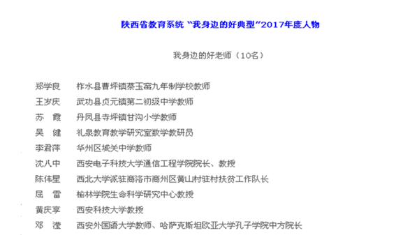 蘇霞等10名教師獲“‘我身邊的好典型’2017年度好老師”榮譽稱號,銅川市王益區(qū)黃堡鎮(zhèn)逸夫小學(xué)校長崔會婷等8名同志獲“‘我身邊的好典型’2017年度好校長(園長) ”榮譽稱號,陜西省自強中等專業(yè)學(xué)校顏學(xué)謙等18名學(xué)生獲“‘我身邊的好典型’2017年度好學(xué)生 ”榮譽稱號。