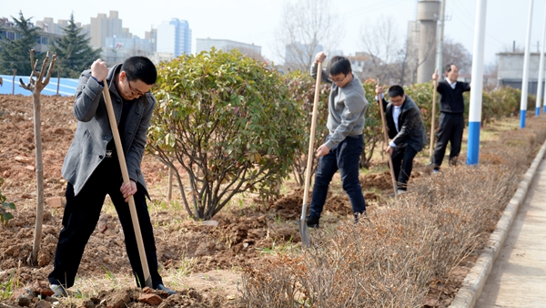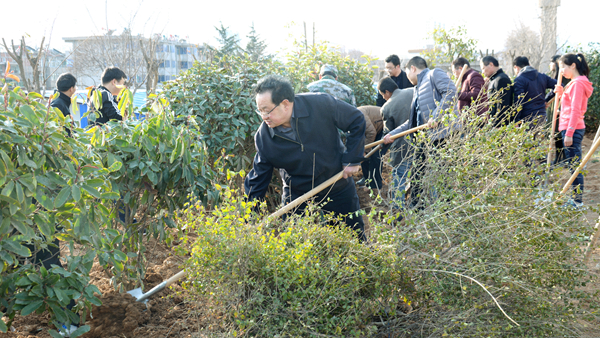 下午2:00,黨員們準(zhǔn)時來到新建綜合教學(xué)樓前,挖坑、植苗、培土,大家歡聲笑語,氣氛熱烈,分工合作,配合默契。不知不覺一個下午過去了,大家植樹種花1000余棵,牡丹園、月季園基本建成,紫薇成行,碧桃成簇,石楠郁郁蔥蔥,校園頓覺春意盎然。