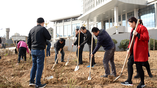 陽春三月,草長鶯飛,正是植樹好時節(jié)。3月1日下午,機(jī)關(guān)一、機(jī)關(guān)二黨總支組織黨員開展了“為校園添綠”主題黨日活動。副校長魏書堂與機(jī)關(guān)80余名黨員在新建綜合樓前栽樹種花,綠化校園。后勤保障處全體職工、機(jī)關(guān)部分民主黨派成員及職工參加活動。