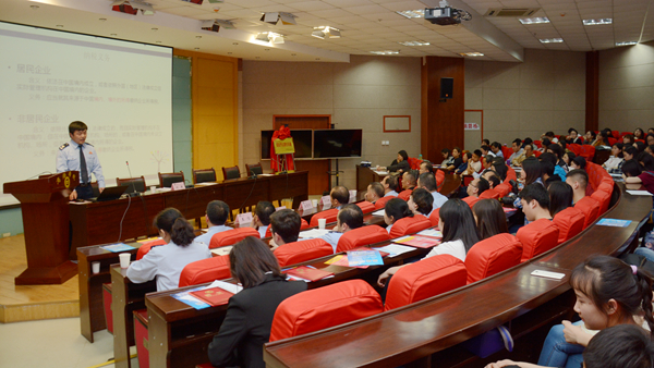 王思懷代表師生對此次稅法活動走進(jìn)我校表示歡迎并發(fā)表講話。他指出,我校歷來高度重視加強(qiáng)師生法治教育、安全教育和誠信教育,在經(jīng)管學(xué)院開設(shè)了稅法課程,借助課堂教學(xué)和每年入學(xué)教育、國家憲法日等節(jié)點(diǎn)開展全校師生參與度高的法律知識普及系列主題活動,加大普法宣傳力度,在師生頭腦中樹立起了較強(qiáng)的法律意識。他表示,開展稅法進(jìn)校園活動既可以進(jìn)一步普及稅法知識,增強(qiáng)師生稅法意識,也為落實(shí)雙方之間的戰(zhàn)略合作協(xié)議開辟了一條新路徑。我們將以此為契機(jī),進(jìn)一步深入學(xué)習(xí)黨的十九大報(bào)告有關(guān)財(cái)稅體制改革目標(biāo)和任務(wù)的論述,深入學(xué)習(xí)我國稅改所取得的成效、未來深化改革所涉及的增值稅、個人所得稅以及新房地產(chǎn)稅三大熱點(diǎn)稅種改革,廣泛學(xué)習(xí)宣講稅法知識,進(jìn)一步增強(qiáng)全校師生稅收法治觀念。