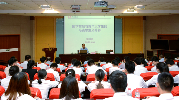 龍治剛從狹義和廣義兩個(gè)角度為同學(xué)們講解了國(guó)學(xué)的含義,并以四部分類法對(duì)國(guó)學(xué)進(jìn)行分類,簡(jiǎn)要介紹了《經(jīng)》《史》《子》《集》各部的主要內(nèi)容。他引用鄧衛(wèi)東的國(guó)學(xué)史觀,結(jié)合自己的親身感受,從不同側(cè)面,用生動(dòng)的事例、精辟的語言全方位闡述了“自然國(guó)學(xué),生命國(guó)學(xué),家庭國(guó)學(xué),公益國(guó)學(xué)”。他以孔子的人生經(jīng)歷為背景,重點(diǎn)講述了儒家思想“仁”“禮”“中庸”“義”“信”的深刻內(nèi)涵,點(diǎn)面結(jié)合,將中國(guó)傳統(tǒng)思想文化里的國(guó)學(xué)智慧娓娓道來。此外,龍治剛還從修身之道、廉政之道、法治之道、民本之道等七個(gè)方面入手,結(jié)合儒釋道文化起源和核心思想,巧妙地將優(yōu)秀傳統(tǒng)文化、現(xiàn)代教育理念、當(dāng)代青年的馬克思主義修養(yǎng)融貫一體,以生動(dòng)有趣的語言引領(lǐng)青年大學(xué)生了解中國(guó)優(yōu)秀傳統(tǒng)文化中的思想精華,引導(dǎo)青年學(xué)子樹立正確的世界觀、人生觀和價(jià)值觀。