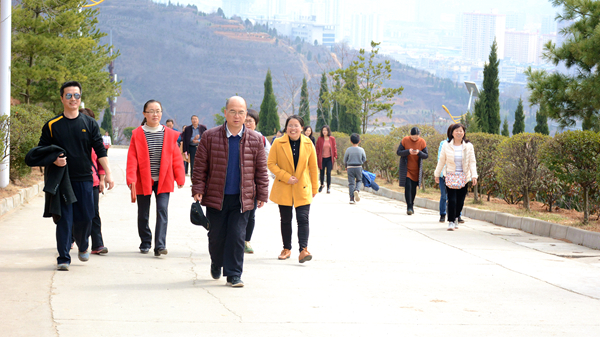 位于商洛市中心廣場(chǎng)北邊的金鳳山,有寬闊的水泥路和蜿蜒曲折的臺(tái)階通往山頂,參加活動(dòng)的教職工們熱情高漲、意趣盎然,三五成群結(jié)伴而行,一邊呼吸著新鮮空氣,一邊飽覽自然美景,或大步流星拾級(jí)而上,或相互鼓勵(lì)穩(wěn)步前行,一路灑下歡歌笑語(yǔ)。待到山頂極目遠(yuǎn)眺,周邊風(fēng)景盡收眼底,美麗的丹江宛若玉帶穿城而過,一幢幢高樓沿江林立,一條條公路向遠(yuǎn)方延伸,春風(fēng)伴著美景,令人心曠神怡,大家紛紛合影留念,定格快樂。