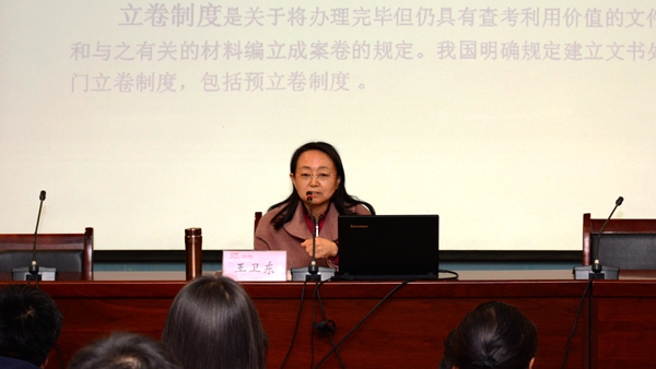 王衛(wèi)東以《文件材料的立卷歸檔及其方法》為題,結(jié)合自身檔案工作經(jīng)歷,全面系統(tǒng)地為我校檔案工作人員闡釋了立卷歸檔工作的重要性及文書立卷人員職責(zé),詳細(xì)介紹了立卷歸檔工作的方法、流程和操作實(shí)務(wù)。她還現(xiàn)場為我校檔案管理工作人員答疑解惑,把長安大學(xué)的檔案管理理念和她個(gè)人的工作經(jīng)驗(yàn)分享給與會(huì)人員。她的報(bào)告通俗易懂、生動(dòng)具體,為我??茖W(xué)規(guī)范地做好檔案材料收集、立卷、分類、組卷、編目、移交歸檔等具體工作提供了有益指導(dǎo)。