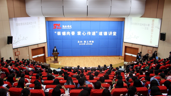 活動在《公民道德歌》悠揚的歌聲中拉開序幕。隨后,學生代表朗誦《道德之歌》《道德經(jīng)》,在場師生共同觀看了2017年感動中國十大人物溫州“蘭小草”的頒獎視頻和我校最美學子、“中國好人”唐偉麗的事跡視頻。學生代表王欣表示,作為青年大學生,在今后的學習和生活中要以道德楷模為榜樣,從現(xiàn)在做起,從身邊的小事做起,做一名崇德向善、傳遞愛心的人。
