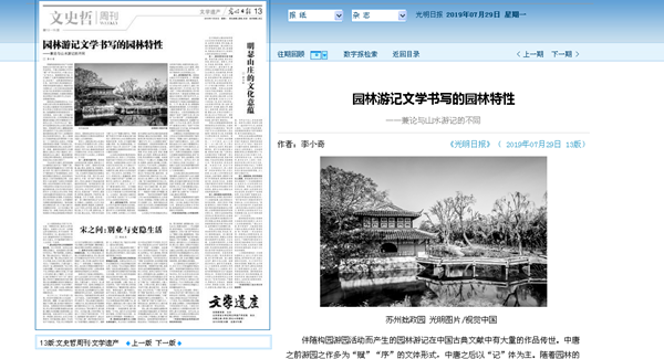我校人文學(xué)院教師李小奇在《光明日報(bào)》2019年7月29日文史哲周刊發(fā)表學(xué)術(shù)文章《園林游記文學(xué)書寫的園林特性》,全文如下: