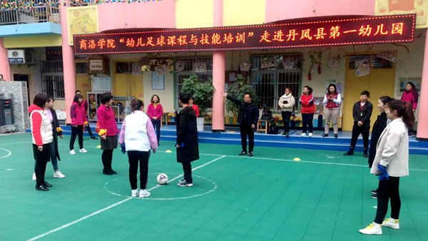 為進(jìn)一步做好結(jié)對(duì)幫扶助力丹鳳脫貧攻堅(jiān)工作,推進(jìn)丹鳳縣幼兒足球示范園建設(shè),我校與丹鳳縣科教體局于11月20日在丹鳳縣第一幼兒園共同舉辦了“幼兒足球課程與技能培訓(xùn)”活動(dòng)。我?!半p百工程”項(xiàng)目首席專家朱小強(qiáng),體育教學(xué)研究部足球教師楊斌,丹鳳縣農(nóng)業(yè)農(nóng)村局、科教體局相關(guān)人員,丹鳳縣5所示范園和5所民辦幼兒園負(fù)責(zé)人及相關(guān)教師參加了此次活動(dòng)。