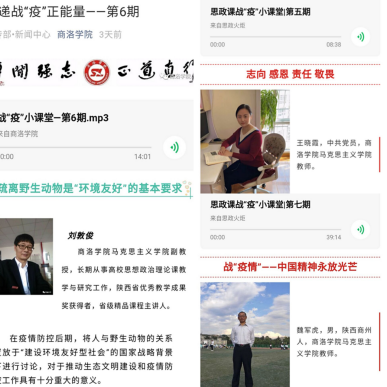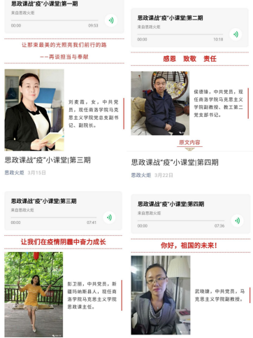 為貫徹落實(shí)習(xí)近平總書記關(guān)于新冠肺炎疫情防控工作的重要講話和指示精神,全力支持配合打贏疫情防控戰(zhàn)、總體戰(zhàn)、阻擊戰(zhàn),按照教育部黨組“停課不停教、停課不停學(xué)”的要求,積極響應(yīng)教育部舉辦的高?!八颊n戰(zhàn)役小課堂”專項(xiàng)活動,助力思政課線上教學(xué),我校馬克思主義學(xué)院通過微信公眾號開辦了“思政課戰(zhàn)疫小課堂”專題欄目,組織學(xué)院教師錄制思政微課,通過文字、圖片加音頻的形式定期向?qū)W生推送,同時(shí)還通過學(xué)校官方微信公眾號進(jìn)行推送,以擴(kuò)大學(xué)生覆蓋面。目前,“思政課戰(zhàn)役小課堂”已經(jīng)發(fā)布7期內(nèi)容,獲得了師生廣泛關(guān)注,進(jìn)一步激發(fā)了師生從我做起、助力抗疫的積極性和自覺性,堅(jiān)定了青年一代勇?lián)鷷r(shí)代使命的決心和信心。