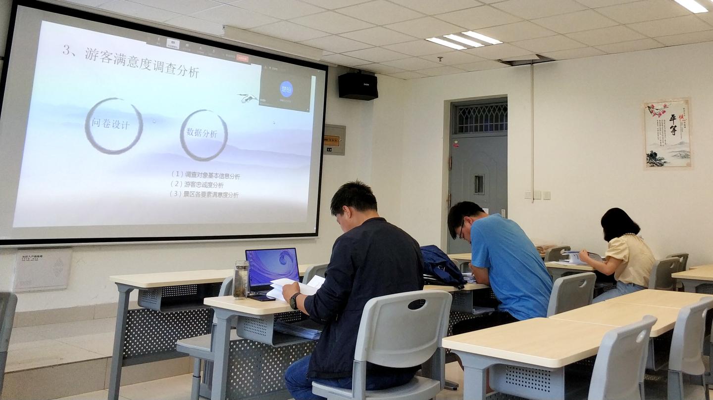 ——線上答辯、井然有序。各學(xué)院根據(jù)實際情況采取線下線上相結(jié)合的方式組織論文答辯。近2000名學(xué)生使用騰訊會議、騰訊課堂、釘釘?shù)确€(wěn)定、流暢的網(wǎng)絡(luò)平臺,通過在線直播互動或視頻會議方式進(jìn)行論文答辯。各學(xué)院根據(jù)本院師生的論文寫作與指導(dǎo)進(jìn)展情況,認(rèn)真組織籌劃,嚴(yán)守時間節(jié)點,科學(xué)制定本學(xué)院畢業(yè)論文(設(shè)計)答辯方案及成績評定規(guī)范,提前做好在線答辯細(xì)節(jié)演練,分配好答辯小組,嚴(yán)密答辯流程,確保了答辯工作與往年現(xiàn)場答辯相比等質(zhì)同效、水準(zhǔn)不降。在線上答辯中,合理分配任務(wù),做好排序通知,保持答辯順暢進(jìn)行。在線下現(xiàn)場答辯中,做好室內(nèi)消殺、開窗通風(fēng),避免人員聚集,嚴(yán)格落實各項防控措施。