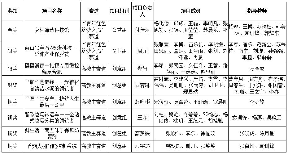 本屆大賽自今年6月啟動以來,我省共有106所學(xué)校報名參加,參賽項目突破4萬項,較去年增加近3000項,參賽學(xué)生突破18.4萬人次,較去年增加1.8萬,經(jīng)校級初賽、網(wǎng)絡(luò)初審、會議評審、線上路演、評委會評審等環(huán)節(jié)后,最終產(chǎn)生金獎100項,單項獎7項。我?;膶W(xué)院學(xué)生付佳樂負(fù)責(zé)的《鄉(xiāng)村流動科技館》項目獲“青年紅色筑夢之旅”賽道金獎;化材學(xué)院學(xué)生周元負(fù)責(zé)的《商山黑寶石/墨烯科技---延伸產(chǎn)業(yè)保脫貧》項目獲得“青年紅色筑夢之旅”賽道銀獎;生物學(xué)院學(xué)生鄭妍負(fù)責(zé)的《穰穰滿家—桔梗專用緩控釋復(fù)合肥》項目、化材學(xué)院學(xué)生同若琳負(fù)責(zé)的《“礦”是奇緣——光催化自清潔水泥的領(lǐng)航者》項目獲得高教主賽道銀獎;健康管理學(xué)院學(xué)生殷煦彬負(fù)責(zé)的《“醫(yī)”生安寧--護(hù)航人生最后一公里》項目、生物學(xué)院學(xué)生高夢蝶負(fù)責(zé)的《鮮生活—南五味子保鮮防腐劑》項目、電信學(xué)院學(xué)生王森負(fù)責(zé)的《智能垃圾轉(zhuǎn)運車——全站式垃圾分類的領(lǐng)航者》項目、電信學(xué)院學(xué)生鄧宇環(huán)負(fù)責(zé)的《香菇大棚智能控制系統(tǒng)》項目獲得高教主賽道銅獎。