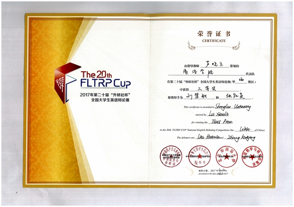 4月28日至30日,第二十屆“外研社杯”全國大學(xué)生英語辯論賽華西賽區(qū)決賽在四川外國語大學(xué)舉行。我校語言文化傳播學(xué)院2014級英語專業(yè)學(xué)生劉慧敏、2013級英語專業(yè)學(xué)生張凱英榮獲三等獎。通過參賽,選手們既開闊了視野,增長了知識,提高了英語口語能力,又鍛煉了思維能力和表達能力。
