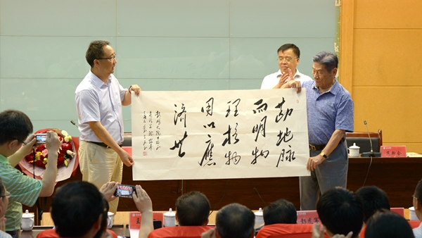為表達(dá)對(duì)趙鵬大院士的敬意和感謝,龍治剛代表學(xué)校向趙院士贈(zèng)送了“勘地脈而明物理,格物用以應(yīng)濟(jì)世”書(shū)法作品?;膶W(xué)院青年教師向趙院士贈(zèng)送了鮮花。