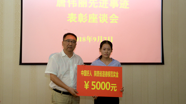 龍治剛代表學(xué)校向唐偉麗頒發(fā)5000元獎金。彭虎軍宣讀了《中共商洛學(xué)院委員會關(guān)于向“中國好人”“陜西省第五屆道德模范”唐偉麗同學(xué)學(xué)習(xí)的通知》。