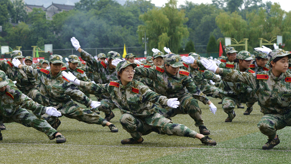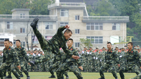 分列式結(jié)束后,軍訓(xùn)教官和學(xué)生進(jìn)行了格斗、匕首操、五步拳匯報(bào)表演。教官們精彩的格斗表演氣勢威猛如虎、出手灑脫有力,盡展果敢剛強(qiáng)的軍人本色,讓人熱血沸騰;女兵們表演的匕首操動作整齊、聲音洪亮,完美詮釋了“巾幗不讓須眉”的豪情壯志;全體參訓(xùn)學(xué)生共同完成的五步拳表演扎實(shí)穩(wěn)健、氣勢磅礴,展現(xiàn)了我校學(xué)子昂揚(yáng)的青春斗志,引起了現(xiàn)場師生陣陣歡呼與掌聲。