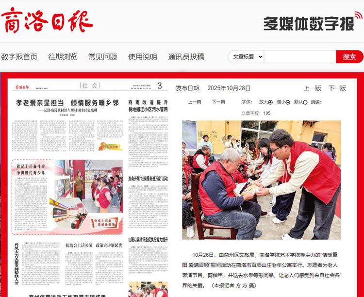 10月26日,由商州區(qū)文旅局、商洛學(xué)院藝術(shù)學(xué)院等主辦的“情暖重陽(yáng) 愛(ài)滿百順”慰問(wèn)活動(dòng)在商洛市百順山莊老年公寓舉行。志愿者為老人表演節(jié)目、剪指甲,并送去水果等慰問(wèn)品,讓老人們感受到來(lái)自社會(huì)各界的關(guān)愛(ài)。 (本報(bào)記者 方 方 攝)