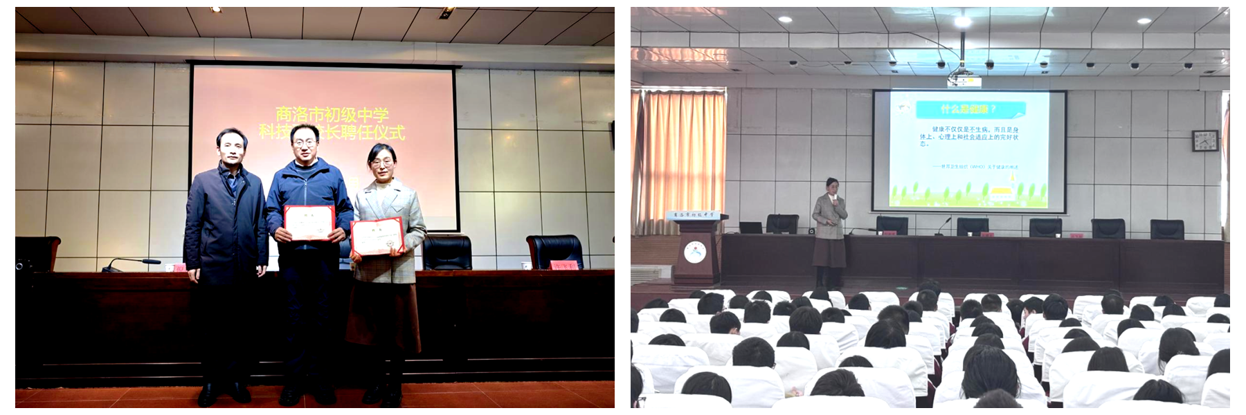 11月19日,應商洛市初級中學邀請,健康管理學院院長郭耀東、公共衛(wèi)生系教師許飛利前往該校開展“科學管理體重,健康快樂成長”主題教育培訓。商洛市初級中學校長倪德博出席活動,并在現(xiàn)場聘任郭耀東為學??萍几毙iL、許飛利為健康教育指導專家。
