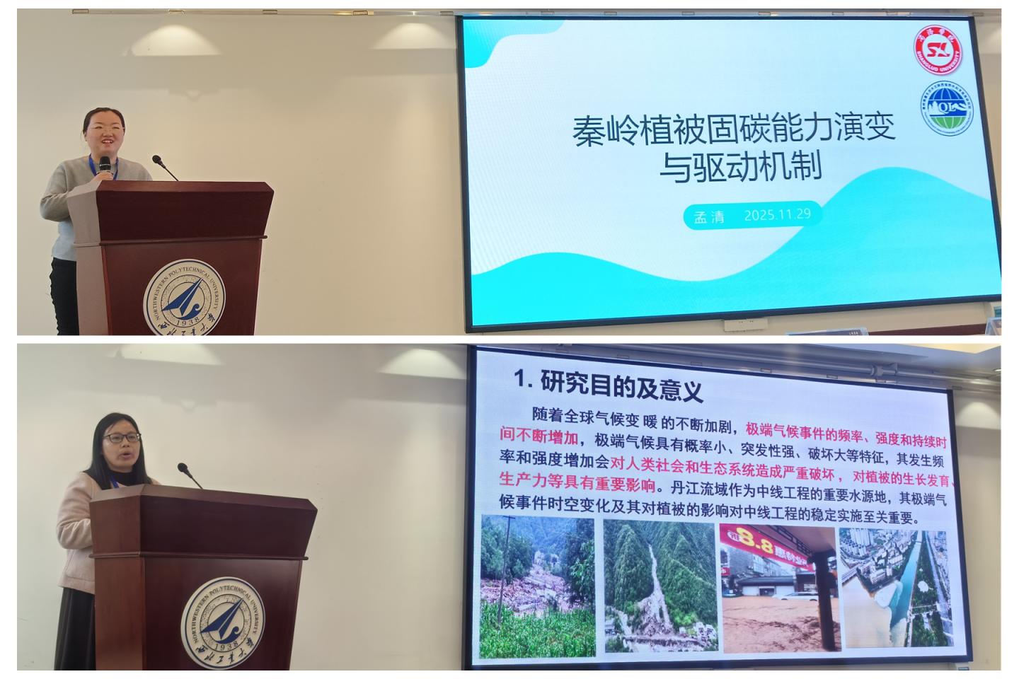 作為秦嶺南麓生態(tài)水文陜西省野外科學(xué)觀測研究站的核心成員,兩位教師分別作了“秦嶺植被固碳能力演變與驅(qū)動(dòng)機(jī)制”和“丹江流域近40年來極端氣候事件對NPP的響應(yīng)研究”為題的會(huì)議報(bào)告。孟清博士以秦嶺地區(qū)NPP、GPP、NEP等指標(biāo)揭示了秦嶺植被固碳的時(shí)空變化規(guī)律及未來發(fā)展趨勢,并以機(jī)器學(xué)習(xí)算法挖掘了其驅(qū)動(dòng)機(jī)制。楊維鴿副教授系統(tǒng)揭示了氣候變化背景下,丹江流域的極端氣候事件的時(shí)空變化特征以及極端氣候事件對NPP的響應(yīng)特征,為氣候變化及植被變化相關(guān)研究提供了科學(xué)借鑒。