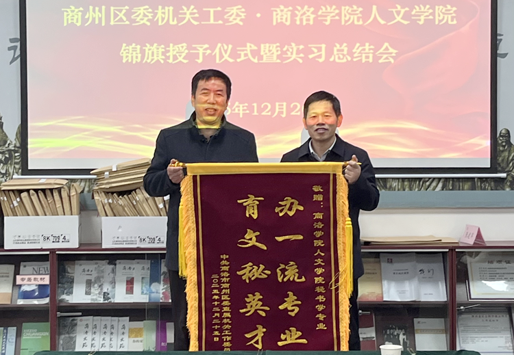 會議伊始,商州區(qū)委機關(guān)工委向人文學(xué)院授予錦旗,對人文學(xué)院秘書學(xué)專業(yè)實習(xí)生在實踐崗位展現(xiàn)出的專業(yè)素養(yǎng)、務(wù)實作風(fēng)和良好精神風(fēng)貌表示高度認(rèn)可與誠摯感謝。金紅衛(wèi)和張文諾分別代表各自單位授旗和接旗。